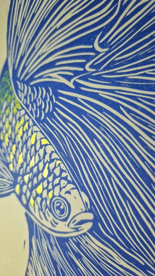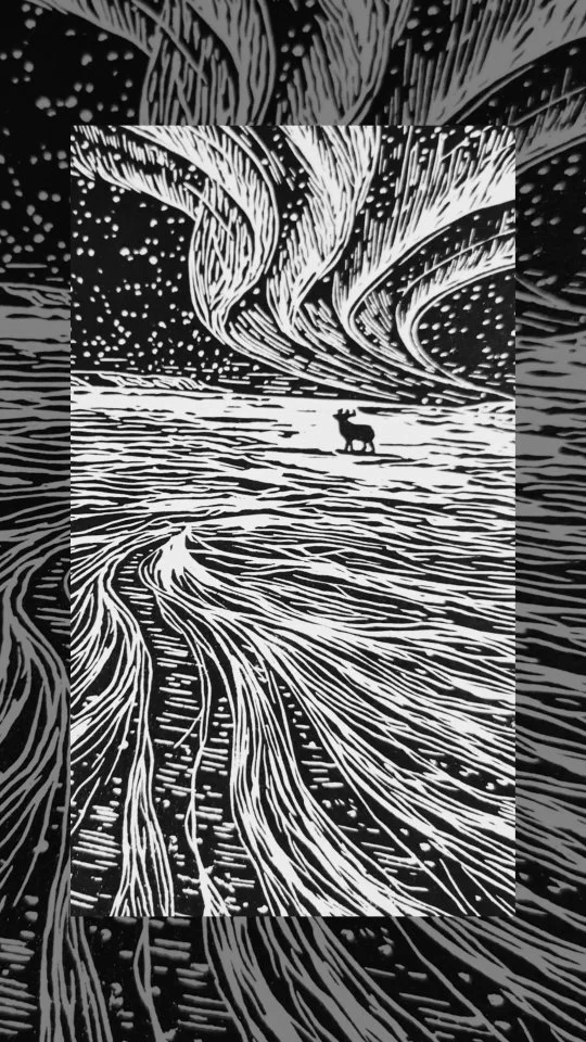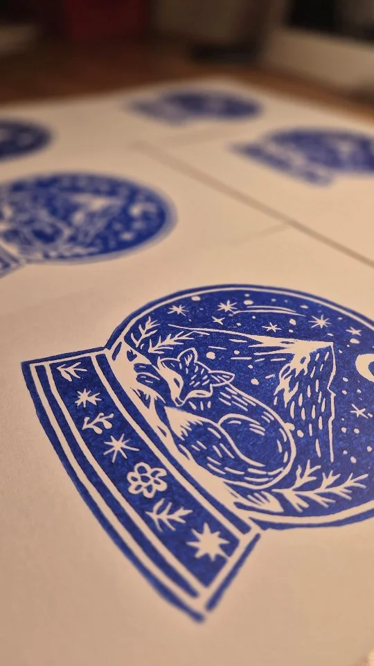 Estampes de Minuit, c’est mon petit atelier de linogravure où je grave et j’imprime des estampes à la main, en petites séries.